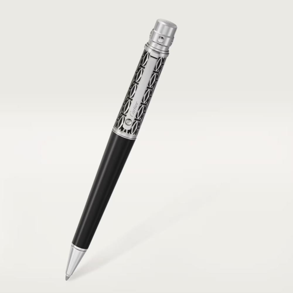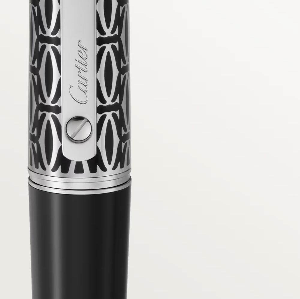قلم حبر جاف (بولبوينت) من مجموعة "سانتوس دو كارتييه"، موديل الحجم الكبير، غطاء من المعدن المنحوت والمطلي باللّكر باللون الأسود والمزيَّن بزخرفة "ديكور دوبل سي"، هيكل من مادة مركَّبة باللون الأسود، طلاء بالبلاديوم. المقاييس: 140.5 × 12.9 مم. يأتي مع عبوة حبر أزرق متوسّطة الحجم لقلم حبر جاف (بولبوينت). تتيح لك كارتييه إمكانية إضفاء الطابع الشخصي على أداة الكتابة الخاصة بك