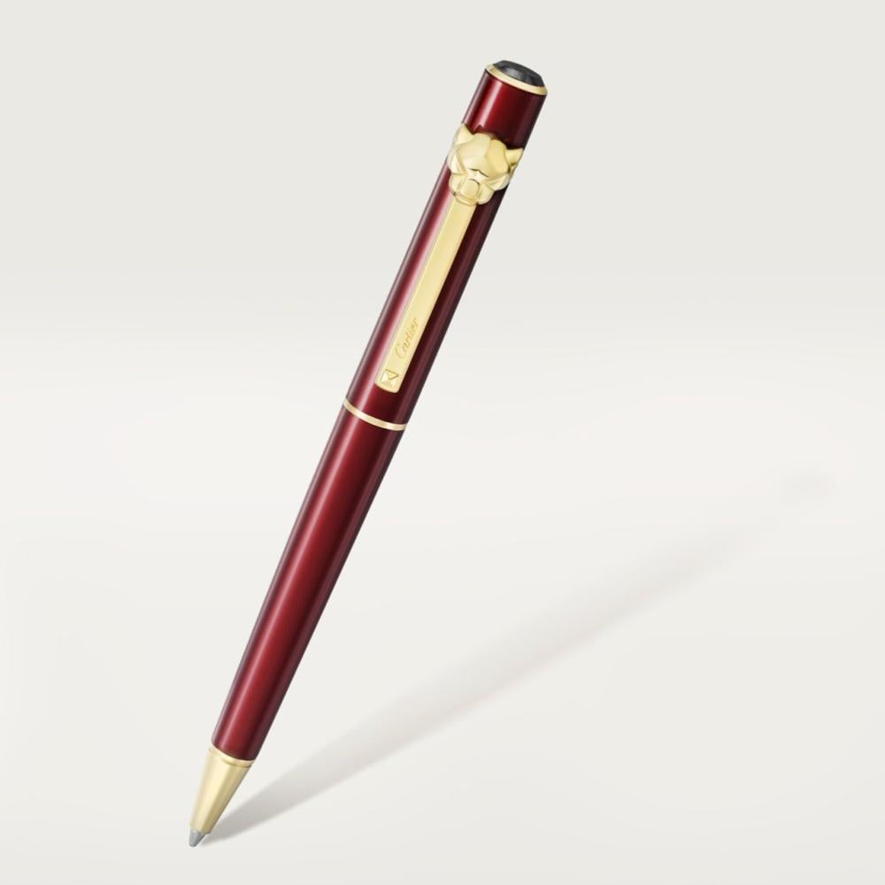 هذه المجموعة هي تجسيدٌ واضح لما عُهِد عن دار كارتييه على الدوام من الإبداع وابتكار القطع الجميلة الفاخرة. فكل واحدٍ من هذه التصاميم يأتي ليبرز فن التمتع بالحياة لدى كارتييه، ويتجلي ذلك في المهارة والتفرّد في تنفيذها وصناعتها التي استُخدمت فيها الجلود والمعادن وأنواع اللاكر والتطعيمات الثمينة جدًا.قلم حبر جاف (بولبوينت) من مجموعة "پانتير دو كارتييه"، موديل الحجم الصغير هيكل وغطاء مطليين باللّكر باللون الخمري الشفّاف، رأس الپانتير من المعدن المصقول وزخرفة "كلو دو پاري" على المشبك، تفاصيل مطلية باللون الذهبي. كابوشون من رخام بيكاسو. المقاييس: 127 × 9.7 مم. يأتي مع عبوة حبر أزرق متوسّطة الحجم لقلم حبر جاف (بولبوينت).