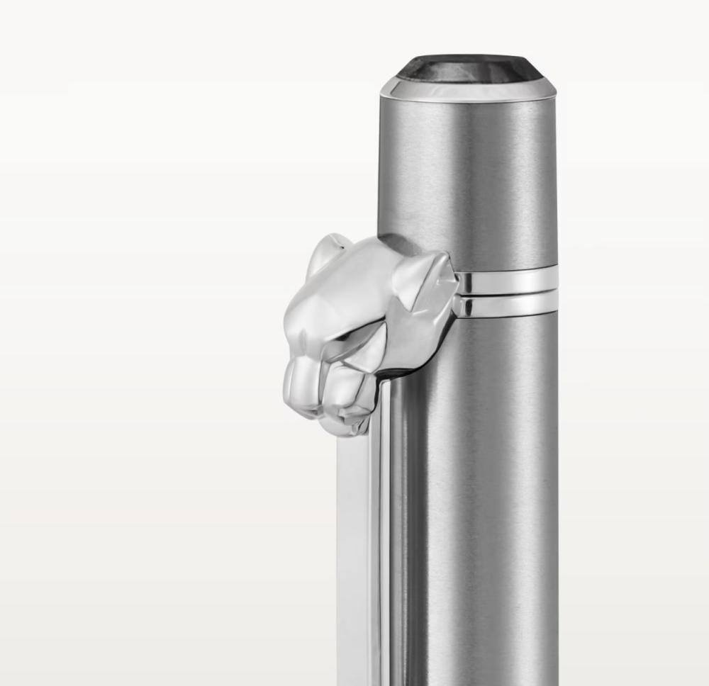 هذه المجموعة هي تجسيدٌ واضح لما عُهِد عن دار كارتييه على الدوام من الإبداع وابتكار القطع الجميلة الفاخرة. فكل واحدٍ من هذه التصاميم يأتي ليبرز فن التمتع بالحياة لدى كارتييه، ويتجلي ذلك في المهارة والتفرّد في تنفيذها وصناعتها التي استُخدمت فيها الجلود والمعادن وأنواع اللاكر والتطعيمات الثمينة جدًا.قلم حبر جاف (بولبوينت) من مجموعة "پانتير دو كارتييه"، موديل الحجم الصغير هيكل وغطاء مطليين بالمعدن المصقول، رأس الپانتير من المعدن المصقول وزخرفة "كلو دو پاري" على المشبك، تفاصيل مطلية باللون الذهبي. كابوشون من رخام بيكاسو. المقاييس: 127 × 9.7 مم. يأتي مع عبوة حبر أزرق متوسّطة الحجم لقلم حبر جاف (بولبوينت).